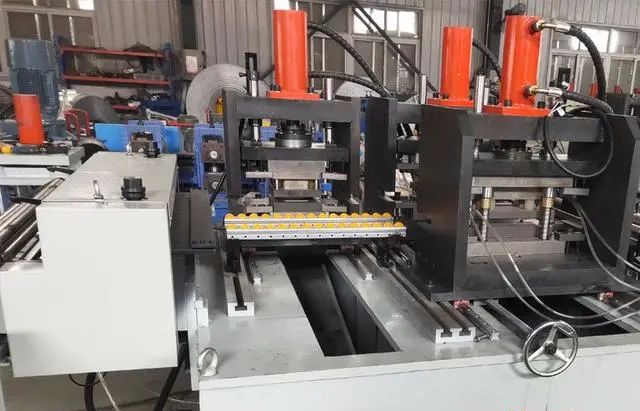 上料開卷→校平→伺服電機(jī)送料→沖床沖孔→冷彎成型→校正校直→液壓定尺切斷→收料(生產(chǎn)線自動連續(xù)工作)